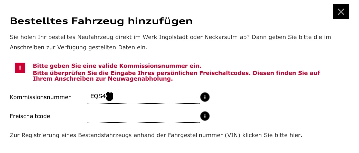 .Calvin1111 said:Danyelson said:Konntet ihr schon euer Fahrzeug in MyAudi anlegen? Mein Freundlicher meinte ich kann das jetzt schon machen. Habe ja eine KOM-Nummer, aber noch keinen Freischaltcode?